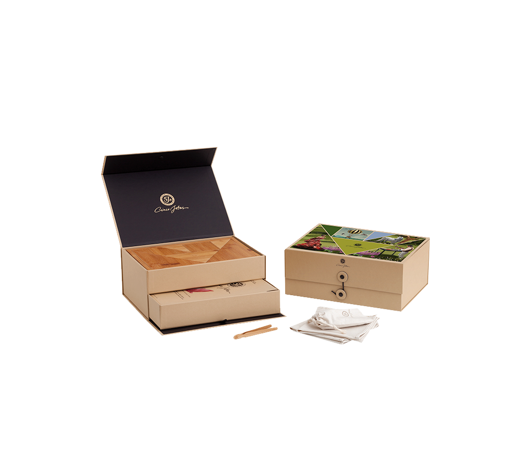 The Tangram El Jardín del Edén box contains the great Cinco Jotas jewels, all of them vacuum-packed so that they can be enjoyed at the most appropriate moment. Let yourself be surprised by the unctuousness of the fat of the delicious sliced 100% Iberian Acorn-fed Ibérico Jamón Ibérico, which remains intact due to its perfect preservation, just like the rest of the sliced Iberian cured meats included in this magnificent gift box.