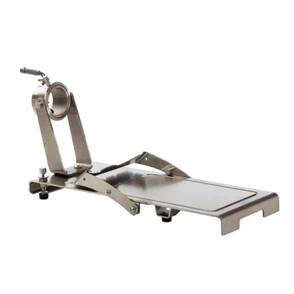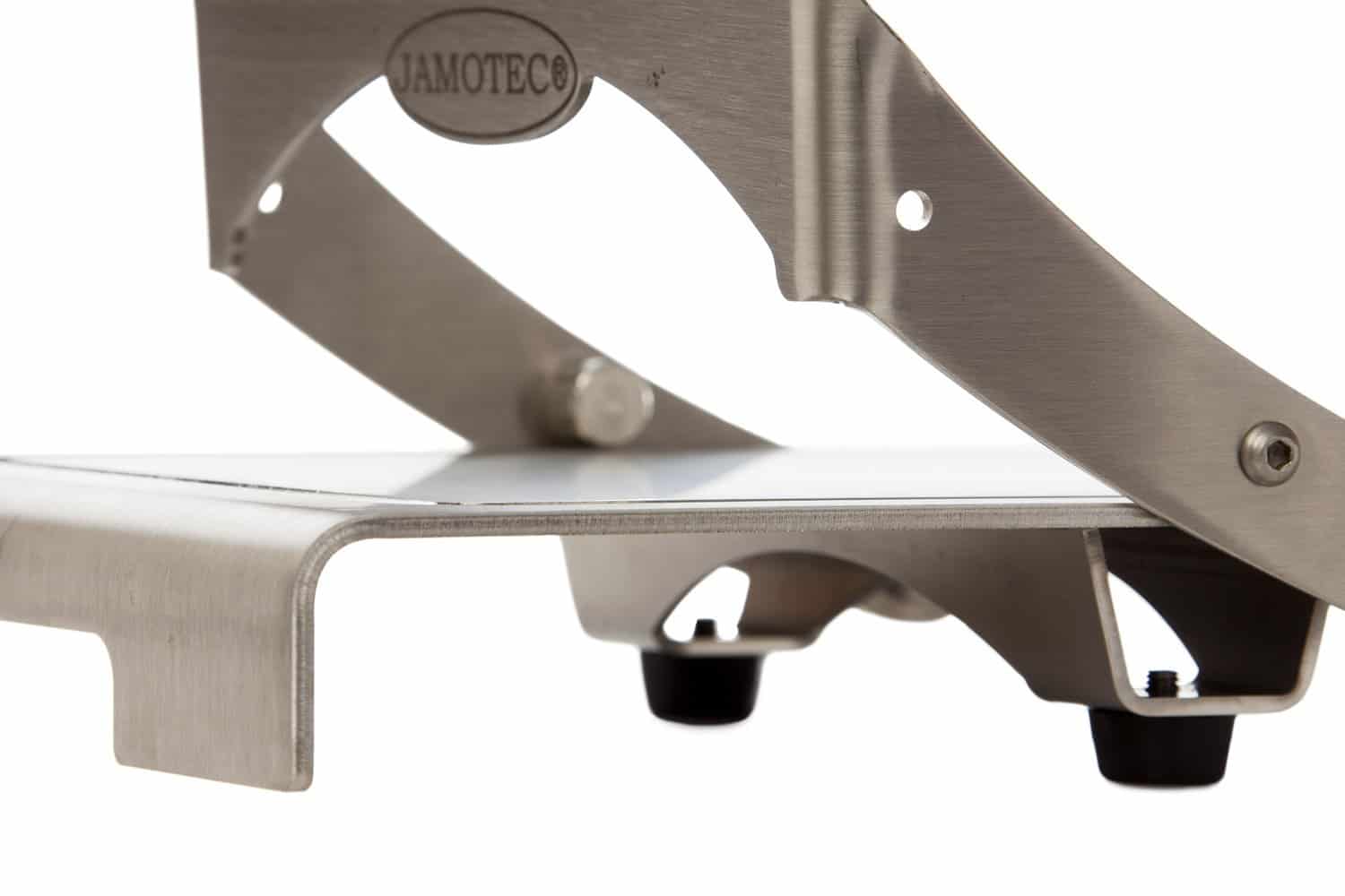 The J2 LUXE Ham Holder comes standard with the Jamotec stirrup that allows the ham or shoulder to be raised to different heights, enabling the different areas of the piece to be worked better. The 24 cm wide stainless steel stirrup with teeth at the end also allows the ham to be cut crosswise (starting at the tip) and increases stability when the ham is already very thin and light.