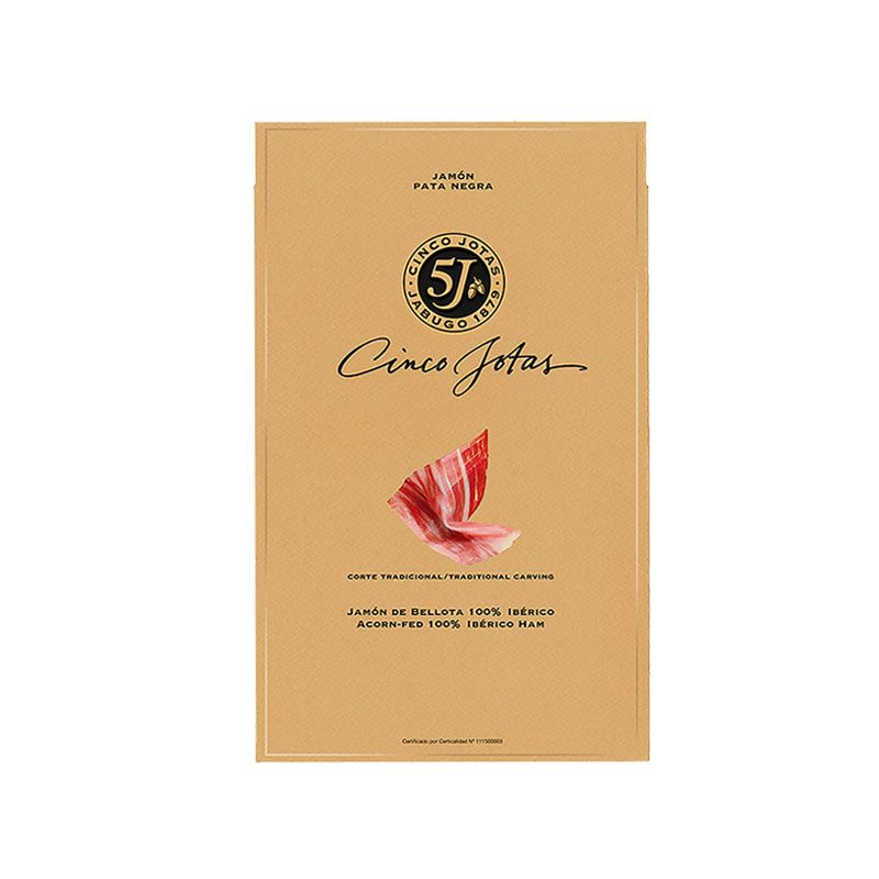 Cinco Jotas 100% Iberian acorn-fed acorn-fed ham, packet of 80 grams, hand-sliced and presented in an individual packet of 80 grams.