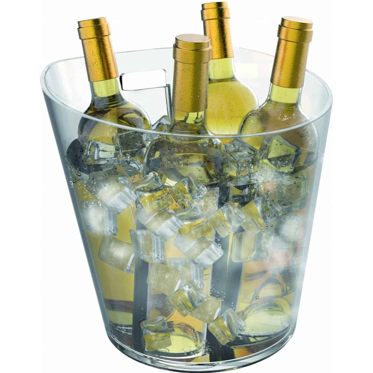 CHARACTERISTICS Capacity: 3-4 Bottles. Material: Polystyrene. Dimensions: H 26,5; W: 27,5 diam: 24,5 cm. Colours currently available: Transparent, white and black (PET material). Customisable item. Turn this ice bucket into a cooler with the accessories: Ice bucket lid and Ice bucket grid. Combine this ice bucket with its table and bar stand: Marea 3 – 4 bottle holder. Possibility of production in any Pantone from 500 units. Delivery time: 1-3 working days. Minimum order: 1 unit.