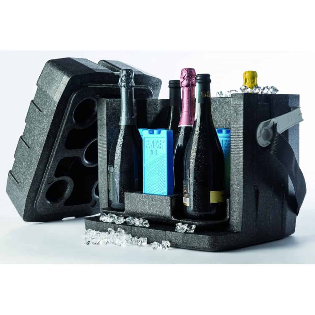 CHARACTERISTICS Material: EPS (insulating, light and resistant material). Dimensions: H 29; W 41,5 cm: H 29; W 41,5; D: 24,5 cm. Capacity: 5 bottles. Includes: 4 cold accumulators, 3 still wine stoppers and 2 sparkling wine stoppers. Can be customised. Delivery time: 1-3 working days. Minimum order: 1 unit.