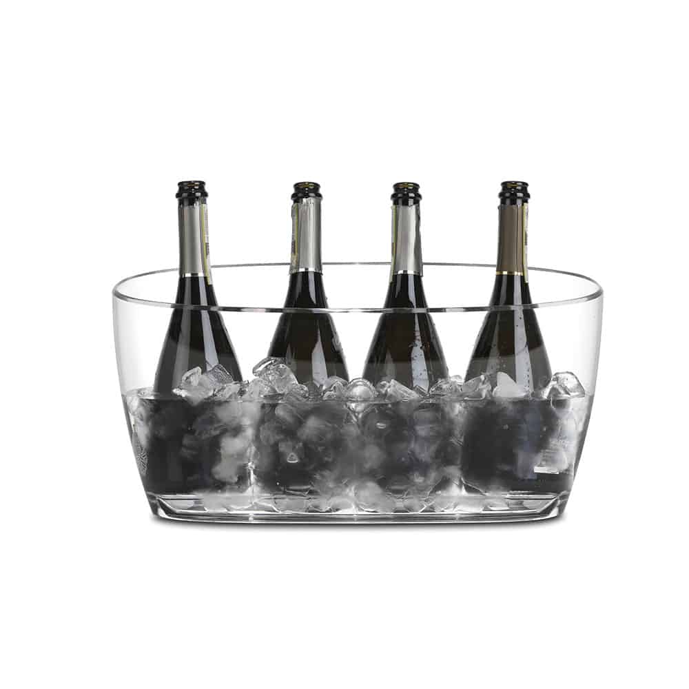 CHARACTERISTICS Capacity: 4-5 Bottles. Material: Acrylic. Dimensions: H 24,3; W 48,2; D 20,9 cm. Colours currently available: Transparent and black. Customisable item. Also available in polystyrene material: See Nice Jeroboam Polystyrene 4-5 Bot. Possibility of manufacturing in any Pantone from 500 units. Delivery time: 1-3 working days. Minimum order: 1 unit.