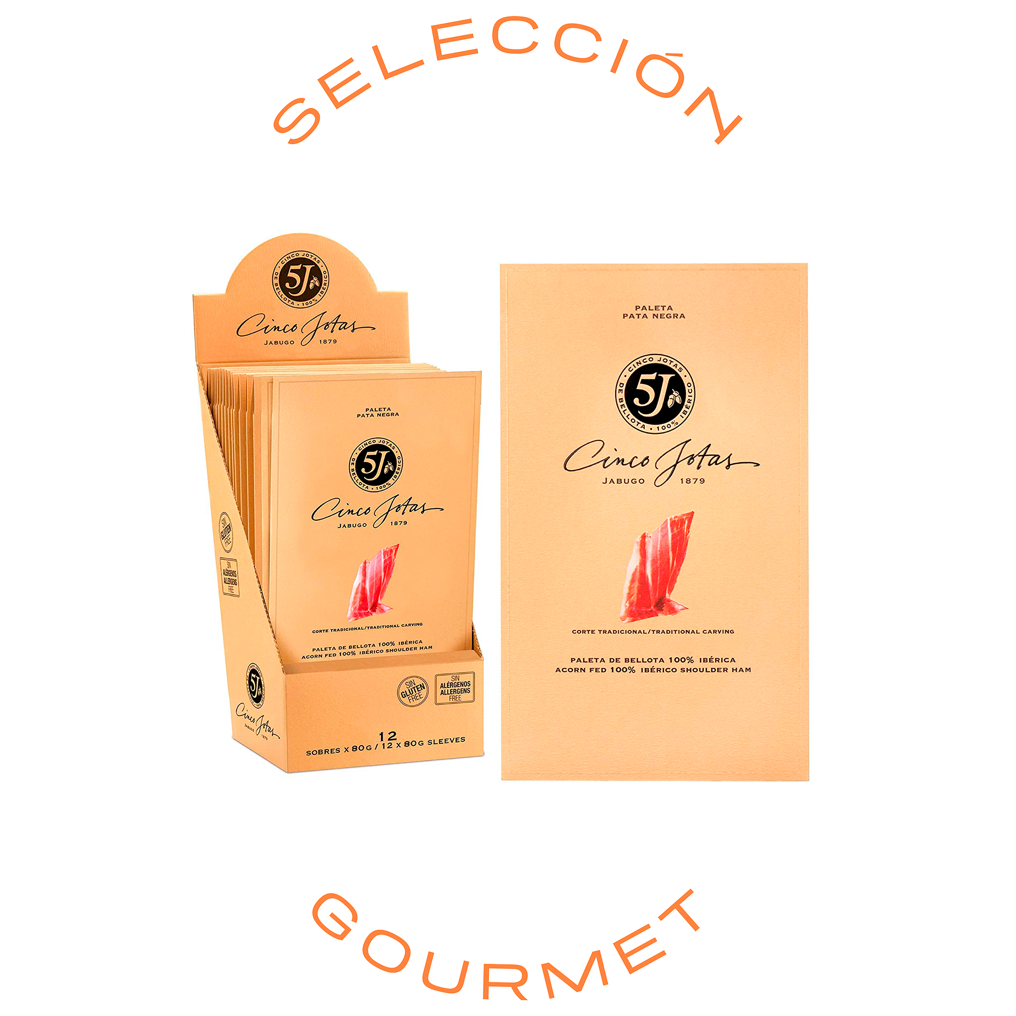 Cinco Jotas 100% Iberian acorn-fed shoulder of acorn-fed pork, hand-sliced and presented in an individual packet of 80 grams. Cinco Jotas shoulder is synonymous with exquisiteness at the table. It has a sweeter and more aromatic flavour than the ham, capable of delighting the most select tasters. This shoulder will be the essential element in your kitchen and the queen of your appetizers. This product is sold by piece and not by weight.