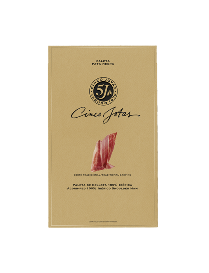 Cinco Jotas 100% Iberian acorn-fed shoulder of acorn-fed pork, hand-sliced and presented in an individual packet of 80 grams. Cinco Jotas shoulder is synonymous with exquisiteness at the table. It has a sweeter and more aromatic flavour than the ham, capable of delighting the most select tasters. This shoulder will be the essential element in your kitchen and the queen of your appetizers. This product is sold by piece and not by weight.