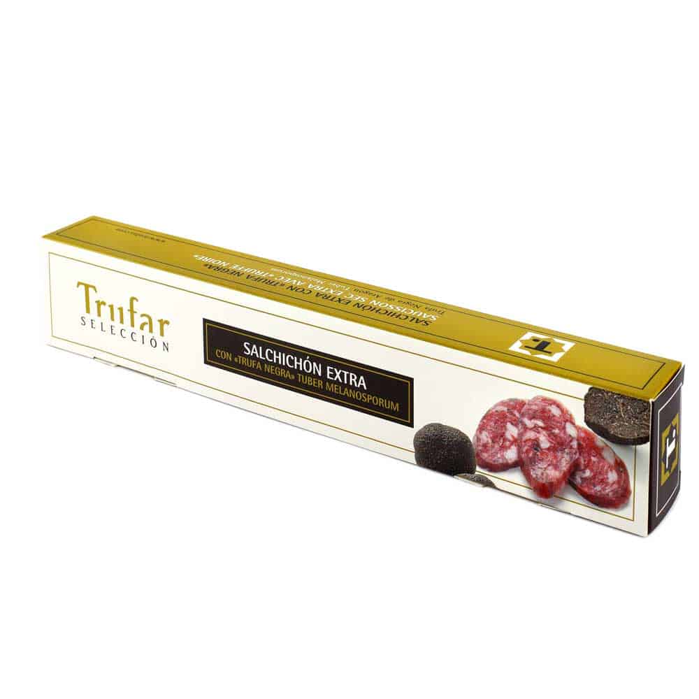 Vacuum packed and packaged. Ideal with wine, cheese to enjoy with friends and family. Salchichón with a deep black truffle flavour. Salchichón made with black truffle from Teruel, Aragon.
