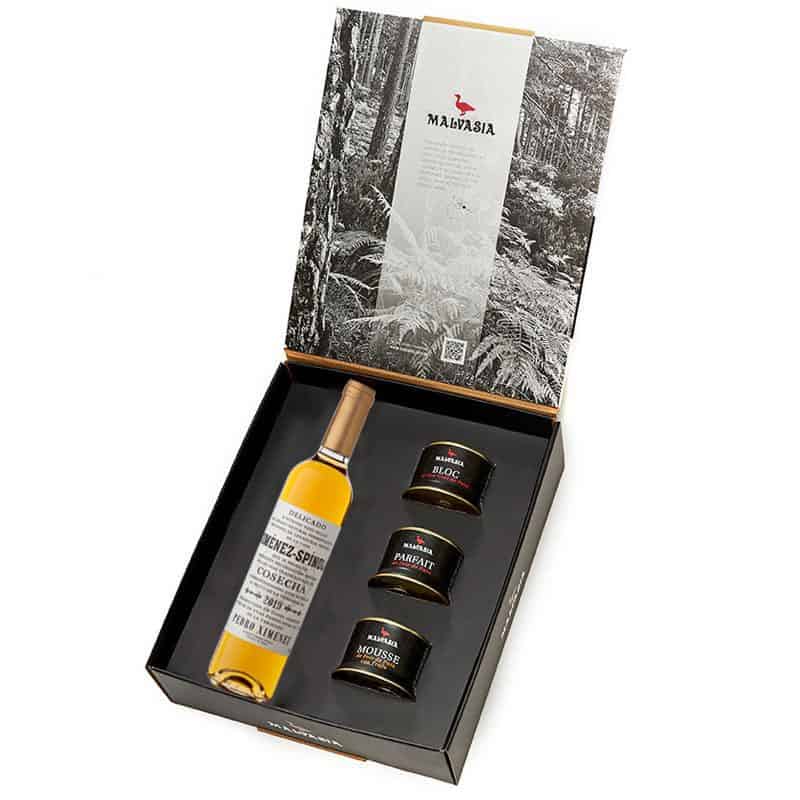 The perfect combination for gourmets and delicatessen gifts, three 130 g Malvasia foie gras of the highest quality, combined with a sweet Pedro Ximénez, perfect to accompany our foie, such as Ximénez-Spínola Delicado, presented in a beautiful box.
