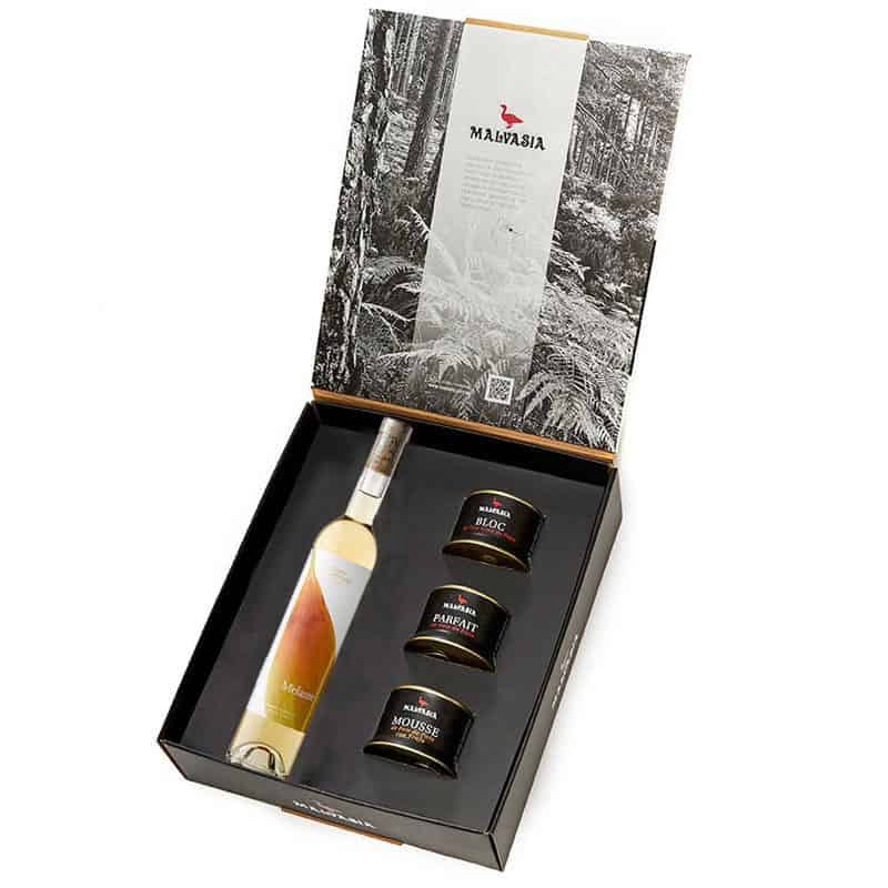 The perfect combination for gourmets, delicatessen gifts; three 130 g Malvasia foie gras of the highest quality combined with a sweet, late harvest white wine, perfect to accompany our foie, such as Melante Colección 2017.